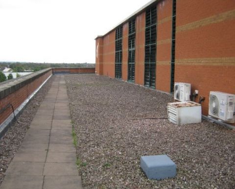 The original roof of the Kellogg’s building is inverted or upside down. This means the waterproof membrane is applied directly to the roof deck with the insulation being loose laid on top, with ballast holding it in place.